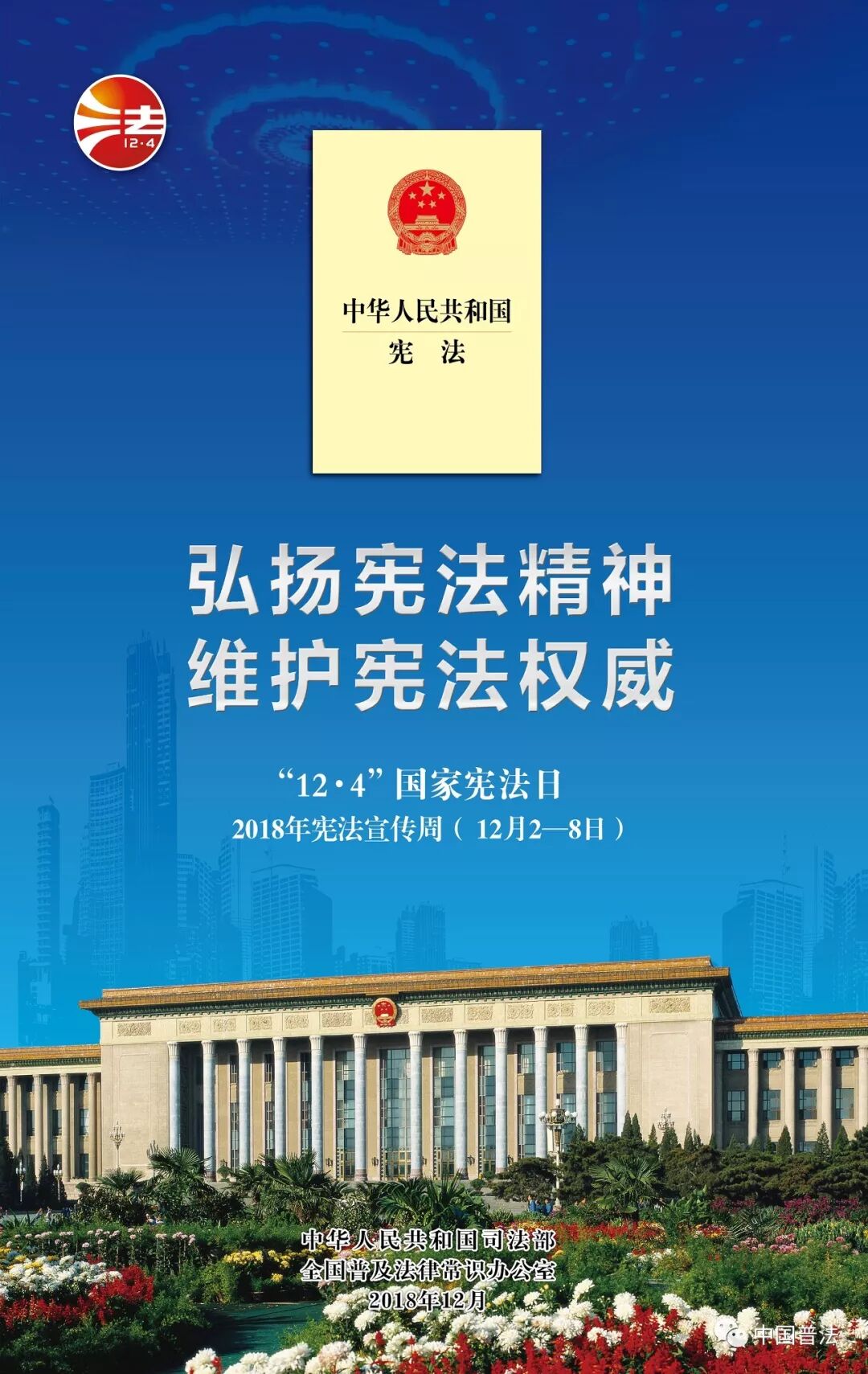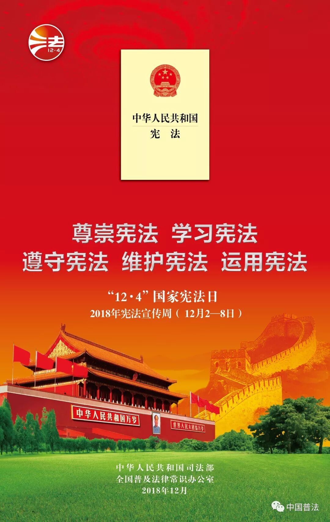 2018年12月4日,将迎来我国第五个国家宪法日,同时也将迎来第一个“宪法宣传周”,这次宣传周活动的主题是“尊崇宪法、学习宪法、遵守宪法、维护宪法、运用宪法"。